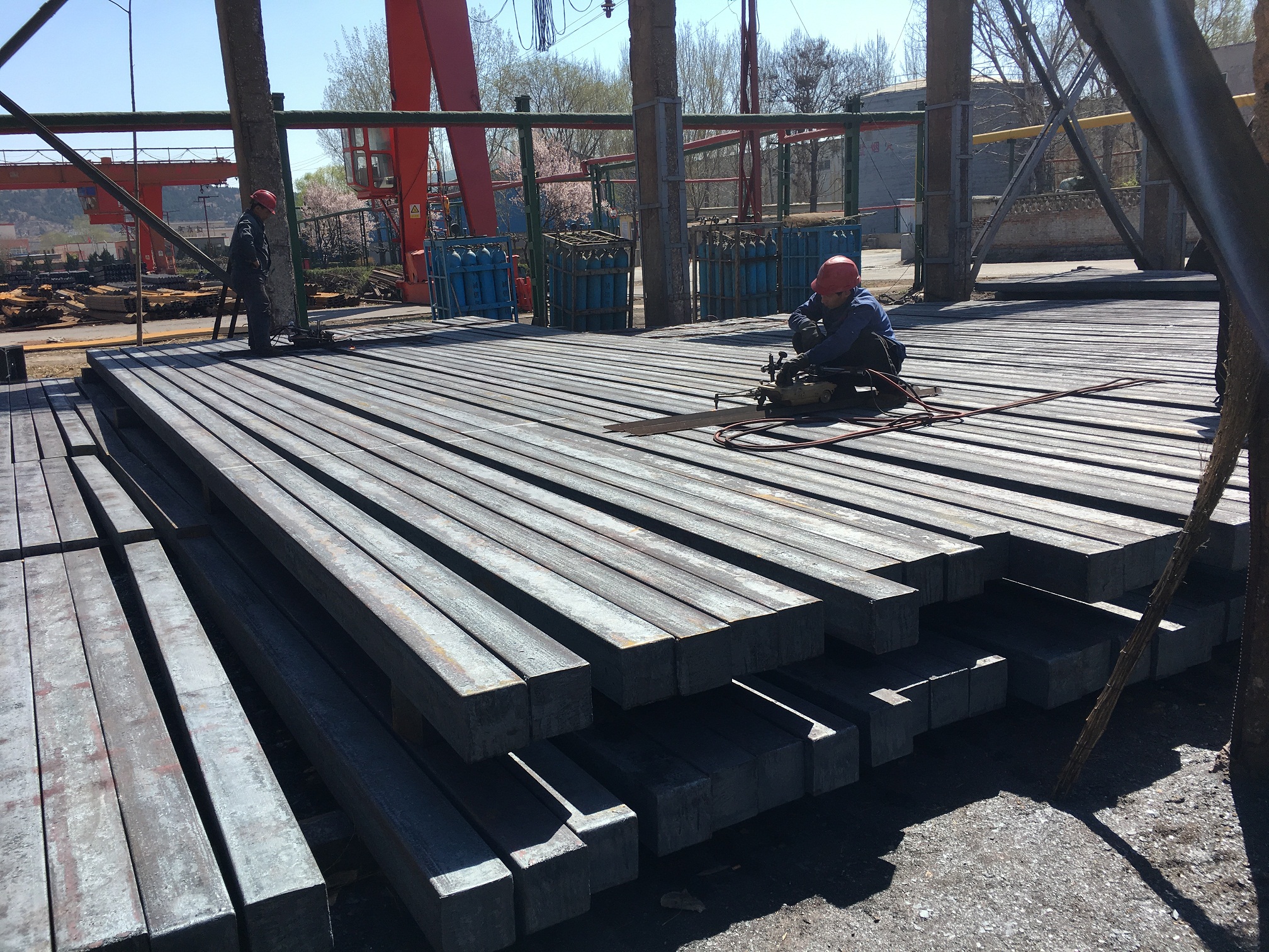 出了生產(chǎn)車間,映入眼簾的便是真正在等待加熱的鋼坯,鋼廠師傅們?cè)跍y(cè)量計(jì)算投入的鋼坯量,與實(shí)際可出的型材量。這是等體積法的運(yùn)用,可以更好的利用原材料,提高成材率。