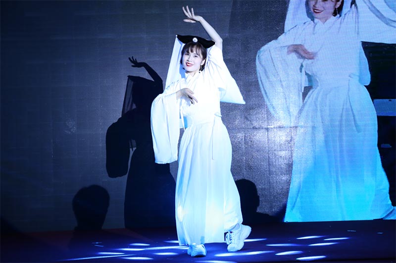 第九個節(jié)目是公司店慶舞蹈總指揮帶來的獨舞《白蛇傳說》,優(yōu)柔舞姿,翩翩入戲