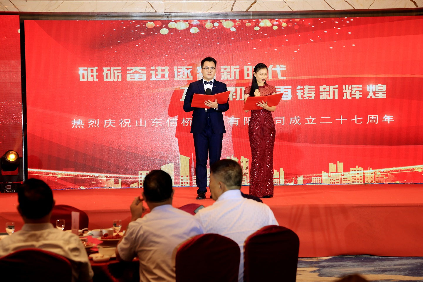 此次慶典晚宴參加人員除了信橋全體員工之外,還有部分老領(lǐng)導(dǎo)和老朋友,大家共同分享了信橋二十七周年的喜悅與精彩。八號上午,慶典開始之前,演員們辛勤排練,燈光師、音響師共同配合,所有人為了晚會都在努力。下午4點(diǎn)58分,晚會正式開始,全體員工與領(lǐng)導(dǎo)集體合影,信橋隊伍不斷在擴(kuò)大。今年的晚會添加新的互動方式,采用了直播和紅包雨的新形式,是信橋周年慶典的一次新的嘗試。